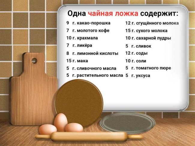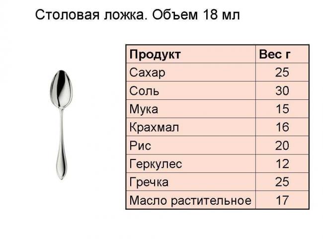 Таблица ниже показывает сколько грамм содержится в различных продуктах в зависимости от количества ложек: