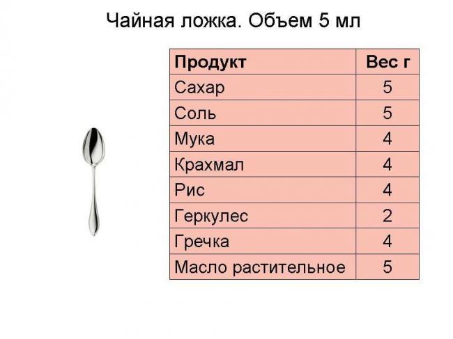 | 1 чайная ложка | 5 граммов |