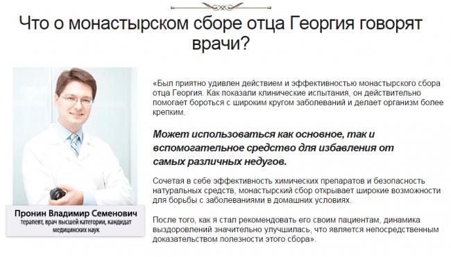 Популярный сбор Отца Георгия стал широко известным публике. Медики не смогли проигнорировать появившийся монастырский чай и провели ряд клинических испытаний. Они длились на протяжении месяца. Испытуемые подверглись тщательной диагностике состояния до приема чая и после. Люди, участвовавшие в эксперименте, имели в анамнезе разные заболевания, некоторые были полностью здоровы. После курса употребления многие полностью вылечились от недугов, даже от таких, как сахарный диабет. Для большинства лечившихся синтетическими препаратами монастырский сбор стал помощником и катализатором процесса выздоровления. А в остальных гораздо улучшилось общее состояние организма. Монастырский чай получил свое одобрение со стороны представителей официальной медицины.