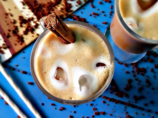 Сироп или топпинг смешивают с соком, смесь со льдом взбивают в шейкере, посыпают корицей; готовый кофе вливают в бокал с приготовленной смесью, подают к столу.