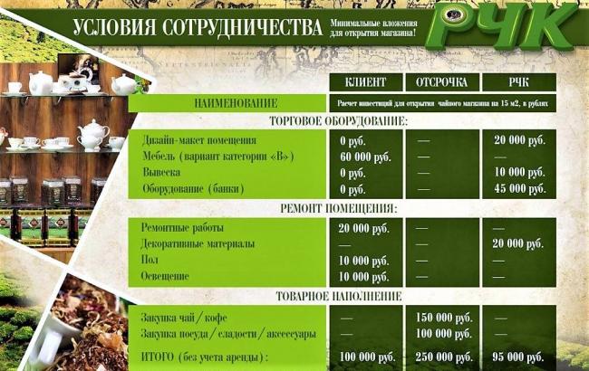 - РЧК. Веб-сайт – rusteaco.ru. Инвестиции – остров от 100 тыс., магазин от 180 тыс. руб. Паушальный взнос – нет. Роялти – нет. Окупаемость – от 4 месяцев.
