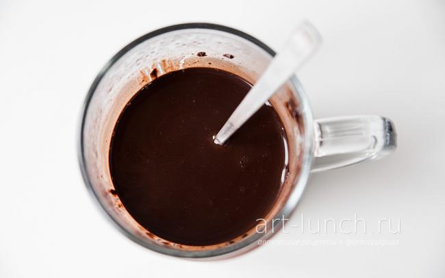 - На водяной бане растапливаем шоколад. Следим, чтобы верхняя емкость не касалась воды, а вода не кипела. Время от времени перемешиваем шоколад лопаточкой.