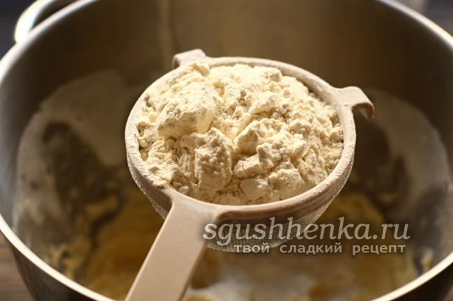 4. Теперь небольшими порциями всыпаем муку, замешиваем однородное тесто.