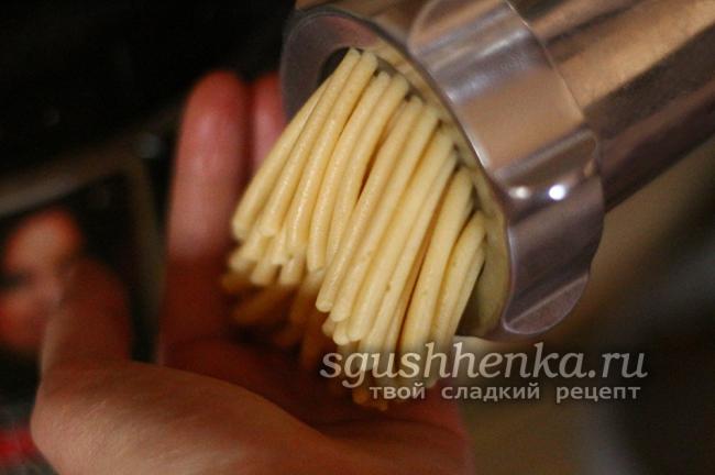 Вытащить нож, оставить только спиралевидный вал и средне-, крупно-фракционную насадку. Прокрутить песочный, пахнущий ванилью, валик, подставив ладонь под низ решетки. Как только «макароны» «вырастут» до 6-8см длины, аккуратно срезать их острым ножом (впритык к насадке).