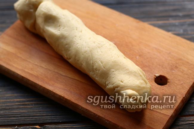 4. Творожное тесто раскатать в виде колбаски толщиной в 5 см и разрезать ее на брусочки толщиной в 3 — 4 см.
