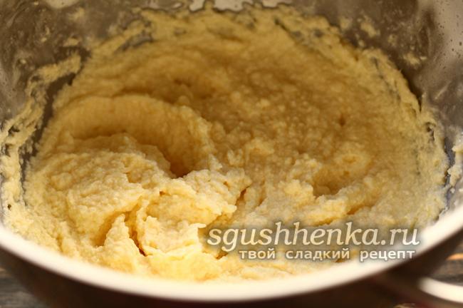 Затем добавляется одно яйцо и размешивается до однородности, только потом вводится второе яйцо и так же тщательно взбивается до пышной массы.