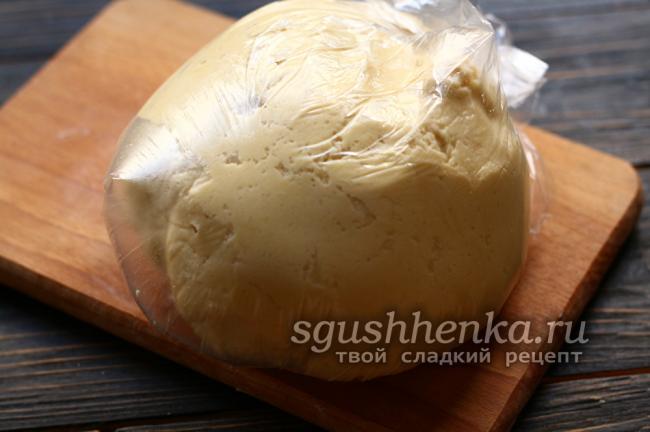 Если времени хватает с запасом и гости уже не в пути, сформировать большой «колобок», обмотать его пищевой пленкой, поставить его на 2-3 часа в холод. Если же к чаепитию нужно подготовиться срочно, разделить тесто на 3-5 шариков, каждый уложить в целлофановый пакет либо пленку, засунуть в морозилку на четверть часа.
