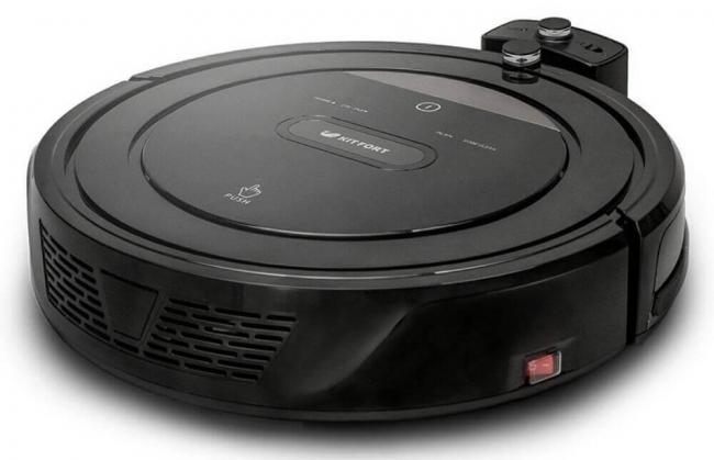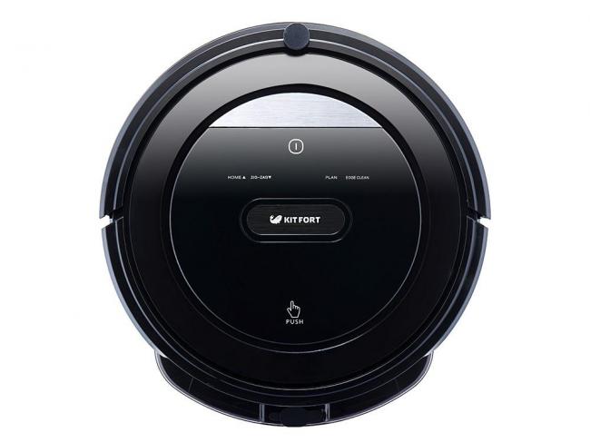 Робот Kitfort имеет классическую круглую форму, изготовлен из пластика черного цвета, на лицевой стороне которого имеется панель управления с сенсорными клавишами и электронный дисплей.