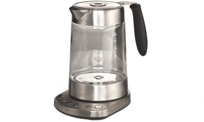 Стеклянная модель с металлическими деталями (26×26,5×15,5 см) включена в обзор из-за необычного исполнения. Управление происходит кнопками на подставке. Крышка съемная. Вместительность 1,7 л. Есть подсветка. Есть терморегулятор, можно выставлять температуру нагрева: 70-100 °C. Сохраняет температуру. Есть опция заваривания чая. О готовности сообщает не только индикатор, но и звуковой сигнал. Пустой не включается. Мощность 2500 Вт.