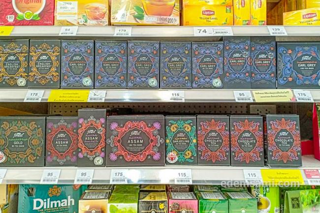Упаковки в Макро хамские, т.е. большие. Если это матум, то пакет 500 г по 80 батов, если каркаде – то 240 батов, если имбирный, то упаковка по несколько пачек или банок. Мой любимый, например, фасуют по 3 пачки за 300 батов. Бывают также оранжевый и зеленый чаи – лучшие варианты из тех, что можно найти в Паттайе, но тоже большими пачками по 500 г. Стоят в районе 120 батов.
