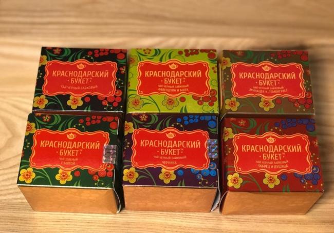- «Краснодарский» чай выпускается по 20, 30 и 90 пакетиков в упаковке. Отличается слегка терпким, уникальным вкусом. В ассортименте классический черный чай и с добавками различных лечебных трав.