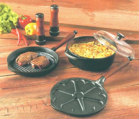 Конструкция большой сковороды должна иметь съёмную ручку (чтобы поставить её в духовой шкаф). У блинницы должна быть длинная удобная ручка из дерева.