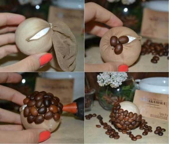 Если вместо шара взять конус и обернуть его джутовой бечевкой, а поверх приклеить кофе, получится новогодняя елка в стиле игрушек Тильда.