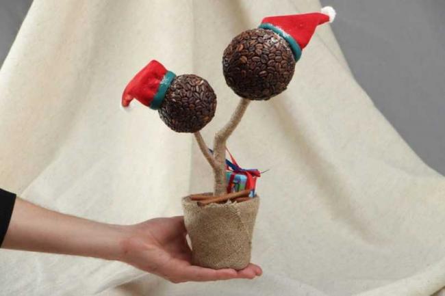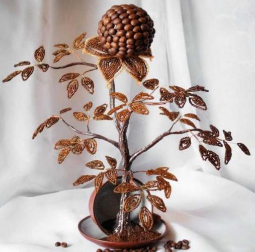 Самая трудоемкая поделка — кофейное дерево или топиарий. Для его изготовления понадобятся пластиковый шарик для кроны, палочка, трубочка или проволока для ствола, гипс и маленький цветочный горшок для основы-крепления. Технология изготовления аналогична описанным выше.