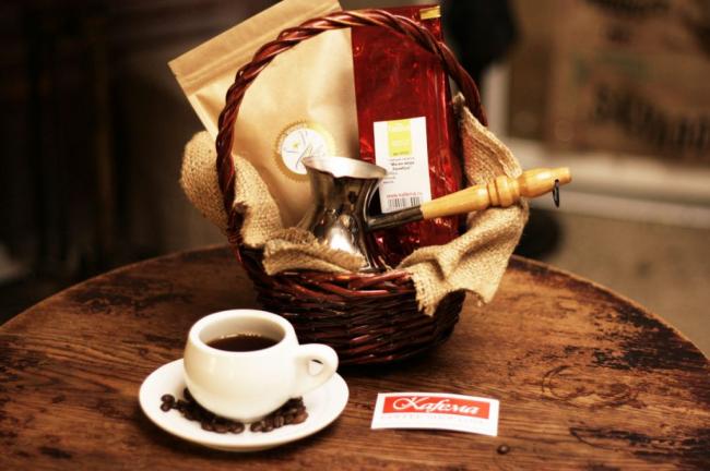 - подарочная корзина с несколькими видами зерен, сиропами, специями, сладостями;