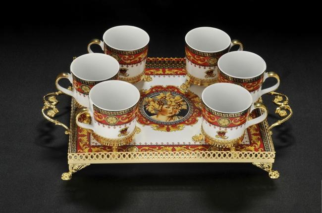 - Набор аксессуаров для приготовления кофе. Комплектация таких наборов может быть разной. Зачастую сюда входит турка, медные чашечки, ложка-зажим для мягкой пачки. Могут добавлять шаблоны для рисунков на пенке, сахарные кружевные салфетки, ложки-дозаторы для специй. Также в набор входят подстаканники и оригинальные подносы. Яндекс.Картинки
