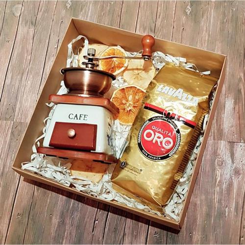 - набор «Кофейная терапия», в который входит миниатюрная кофемолка, элитные зерна, изящная чашечка и тематические магниты на холодильник;