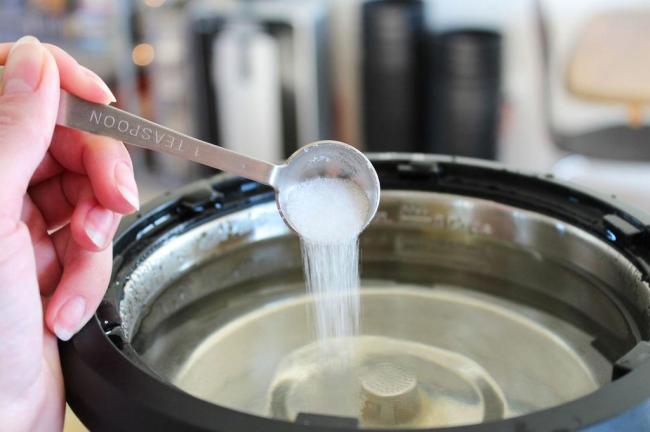 - Залить в емкость чистую воду и добавить 3-4 ложки лимонной кислоты и дождаться полного растворения кристалликов.