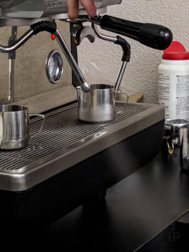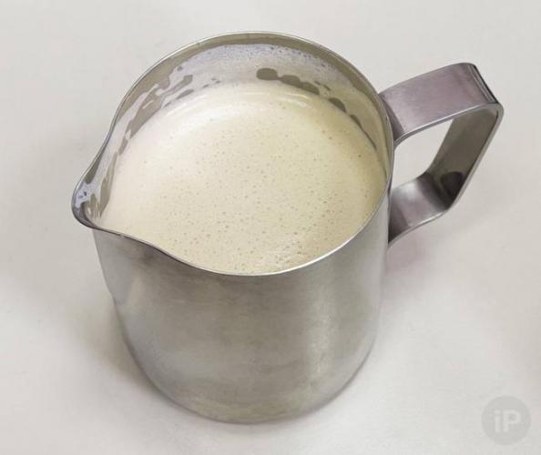 Чтобы сделать пенку в напитках, молоко взбивают в металлическом питчере с помощью паровой трубки. Чем выше и дольше держать сосуд, тем более пористым будет напиток.