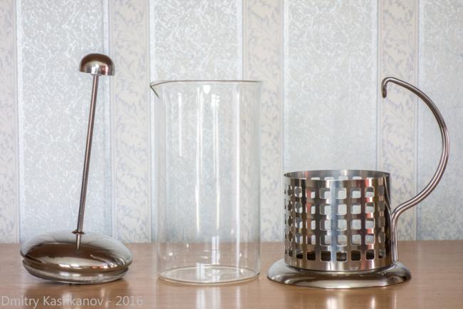 Вся посудина разбирается на три части: подстаканник, колбу и крышку с поршнем: