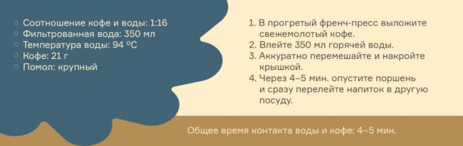 Заваривание кофе происходит так: в корпус насыпается молотый кофе и наливается горячая вода. Через пять минут с помощью прикрепленного к крышке плунжера отжимается осадок: при надавливании на поршень последний опускается вниз, а кофе, в свою очередь, опускается на дно колбы и утрамбовывается. Поверх его остается чистый напиток. Все достаточно просто и эффективно!