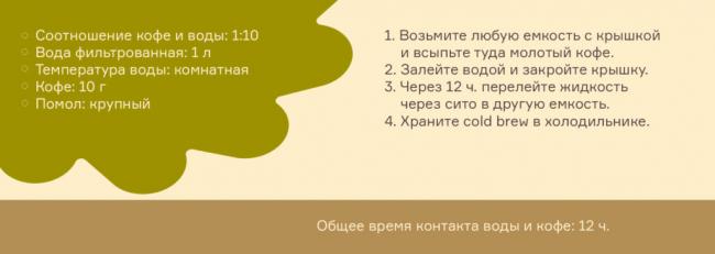 Метод колд брю заключается в том, что молотые зерна настаивают в холодной воде. Потребуется взять кофе крупной фракции в 1,5 раза больше, чем для обычного заваривания горячей водой. Кофейный порошок всыпают в стеклянную банку подходящего объема, заливают кипяченой водой комнатной температуры, перемешивают. Емкость закрывают крышкой и настаивают 10-12 часов. Чем дольше время настаивания, тем крепче получится кофе.
