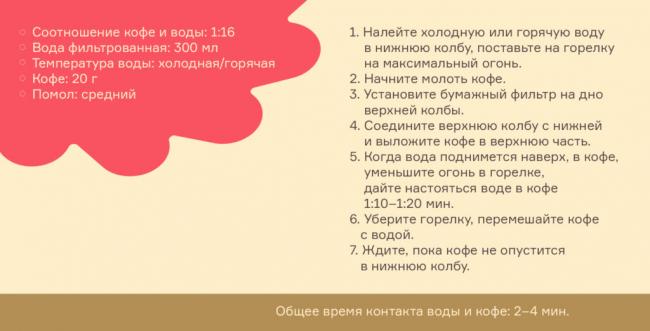 Изобретение середины XIX века сегодня не отличается высокой популярностью, но эффектное приготовление и ощущение, что участвуешь в каких-то химических экспериментах, не дают умереть такому способу приготовления, как сифон. Сифон состоит из двух частей: нижняя похожа на колбу, куда заливается вода; верхняя часть с продолговатой трубкой, в нее выкладывается кофе. Когда сифон собран, между двумя частями можно обнаружить резиновую прокладку, а внутри верхней части фильтр. Когда нижняя часть сифона нагревается, вода доходит до кипения и переходит в газообразное состояние. Из-за высокого давления в нижнем сосуде вода выталкивается в верхний (как в гейзерной кофеварке). Какое-то время горячая вода заваривает кофе, а когда горелку убирают, в нижнем сосуде остатки воды переходят в обратное состояние, давление в колбе уменьшается — и уже заваренный кофе опускается обратно в нижнюю часть сифона, проходя через фильтр.