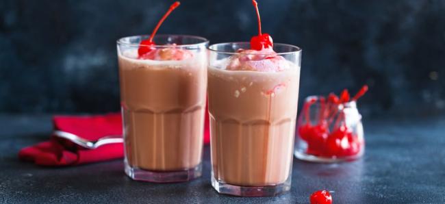 При взбивании напитка добавьте тертый шоколад — около 20 грамм, а также натуральный мед — около 5 грамм. Смесь, как обычно, влейте в стакан с колотым людом, а в качестве украшения используйте шоколадную крошку или ягоды — свежую или замороженную клубнику, вишню, малину или даже клюкву.