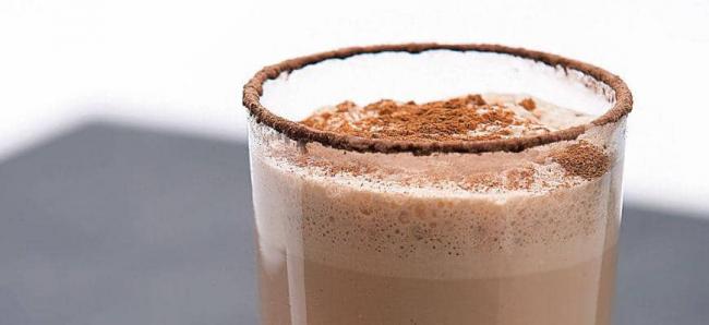 В емкости миксером смешивают все составляющие, добавив немного корицы. Для пикантного вкуса можно всыпать щепотку кайенского перца. Когда образовалась густая пена, напиток переливают в наполненный льдом высокий стакан. Для украшения используют взбитые сливки, шоколадный топинг.