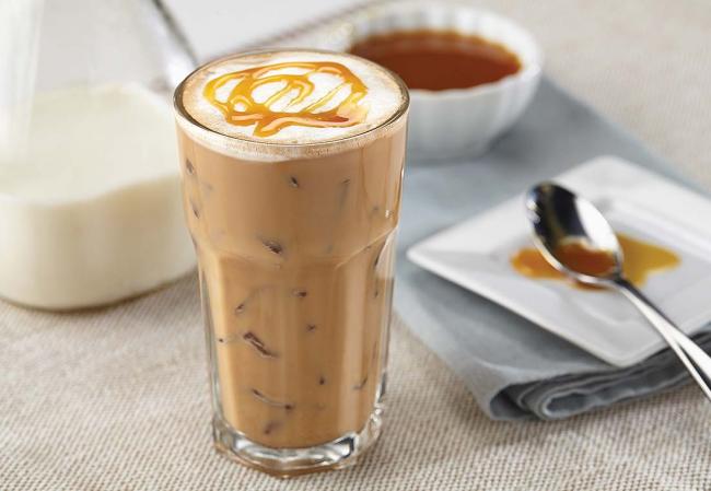 В чашку для подачи кладут кусочки льда и наливают смесь кофе, молока и карамельного сиропа. Украшают шапочкой сливок и карамельным соусом наносят рисунок.