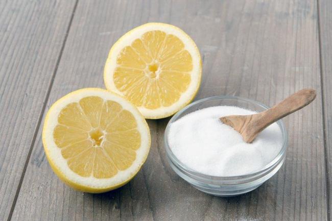 Лимонку смешивают с содой в пропорции 1:2 и наносят смесь на пятно. Затем добавление нескольких капель воды заставят компоненты прореагировать друг с другом, смесь будет пузыриться. Выжидают некоторое время (5-10 минут) и стряхивают остатки смеси щеткой.