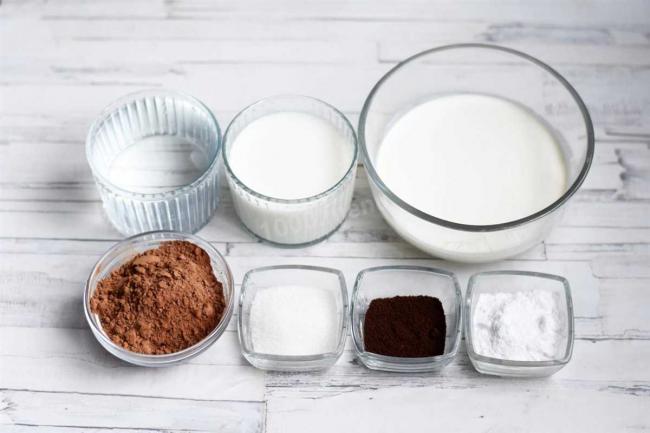 - Вливаем в небольшой сотейник сливки и молоко. Подогреваем до образования пара (не даем закипеть) и высыпаем какао-порошок. Делаем это постепенно, чтобы не образовалось комочков. Все ингредиенты перемешиваем.