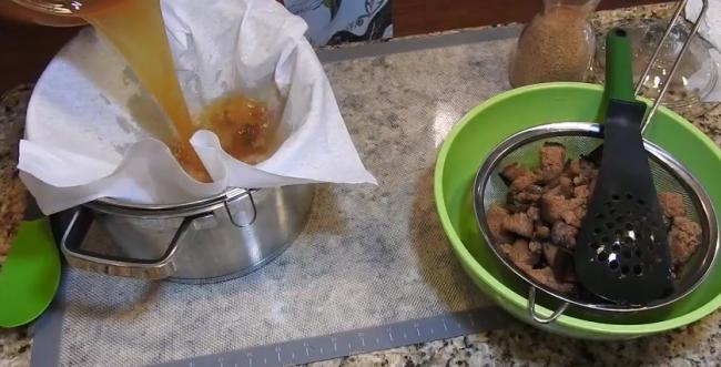 Затем над глубокой посудой устанавливаем сито, выстилаем его многослойной марлей. Через это сооружение процеживаем настоявшееся содержимое банки.
