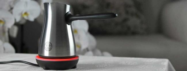 Электрическая турка Gorenje. Мощность прибора 800 Вт, что не дает воде быстро закипать, поэтому кофейный порошок лучше экстрагируется. Стенки внутри выполнены из нержавеющей стали, а сверху пластиковые – это позволяет снижать температуру корпуса во время варки. Объем джезвы 300 мл рассчитан на 3 порции кофе.