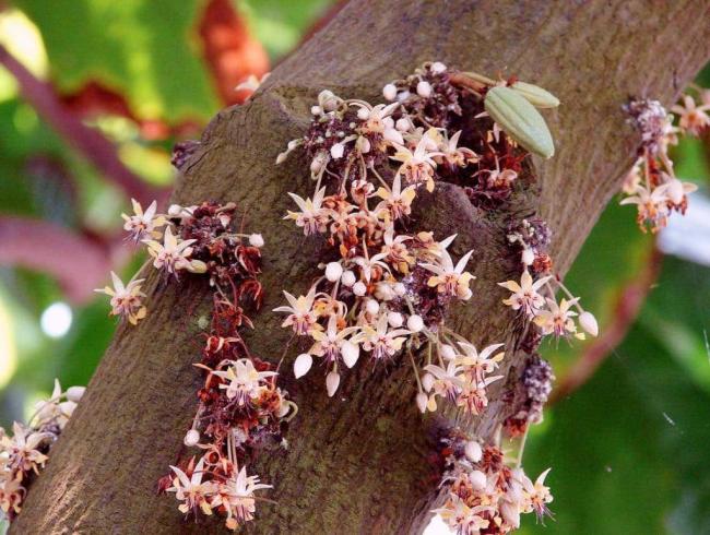 Тип цветения дерева называют каулифлорией. Он присущ растениям тропиков. Цветки распространяют неприятный запах, привлекающий бабочек и навозных мух. Они же являются и опылителями.