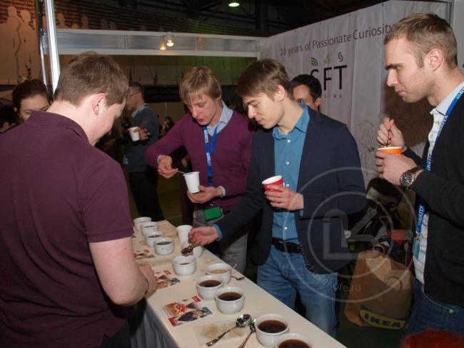 Иду я среди многообразных разукрашенных стендов в поисках где-бы выпить очередную чашечку эспрессо и слышу резкие кратковременные звуки похожие на засасывание бумажки в пылесос. Подхожу к одному закутку, у которого столпился народ, и точно, позывные отсюда! Опыт пролезать в любую щель среди людей приобрел еще в веселые 90-е, поэтому проблем очутиться в самой гуще событий не возникло. В итоге предстал пред моим взором ряд посетителей с ложками в руках, которыми они последовательно сначала набирали кофе, потом выпивали странным методом, затем окунали в кружку с водой и так по кругу.