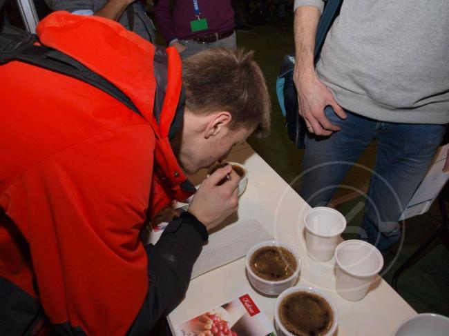 Рядом послышалась фраза: «мне не хватило кофеина на предыдущем стенде, дайте поскорее продегустирую на этом». «Матерая, — подумал я, — прямо не кофеманка, а кофенаркоманка…». Чтобы эффект не стал обратным и дегустатор не получил передозировку дают стаканчик для сплевывания. Но даже этот процесс используют по максимуму — оценивают послевкусие.