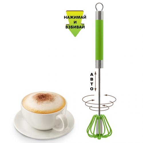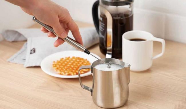 Конструктивно такие взбиватели представляют собой маленький металлический венчик в виде кольцевой пружины с корпусом и кнопкой управления. Они погружаются в емкость с животным или растительным молоком и вращательными движениями быстро взбивают пену.