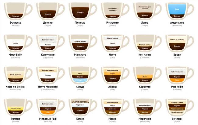 - Латте: большое количество молока, добавленного к эспрессо. Обычно соотношение составляет 1/3 эспрессо и 2/3 молока.