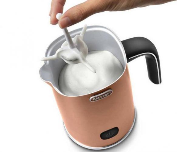 Вспениватель для молока от известного производителя кофеварок и кофемашин отличается безупречным качеством и стильным внешним видом. Матовое покрытие в этой модели дополнено хромированными деталями, дизайн можно охарактеризовать как современный и лаконичный. Прибор быстро вспенивает холодное молоко или предварительно подогревает его. Есть функция нагрева без вспенивания. Внутренняя поверхность чаши имеет качественное антипригарное покрытие, с ним можно не беспокоиться, что молоко пригорит и приобретет неприятный привкус.