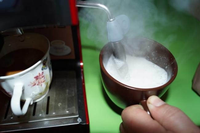 - наконечник паровой трубы погружается в молоко возле стенки кувшина под углом 45 градусов, на глубину не более 1 см (так как требуется, чтобы пар захватывал с собой и воздух, необходимый для образования пены);