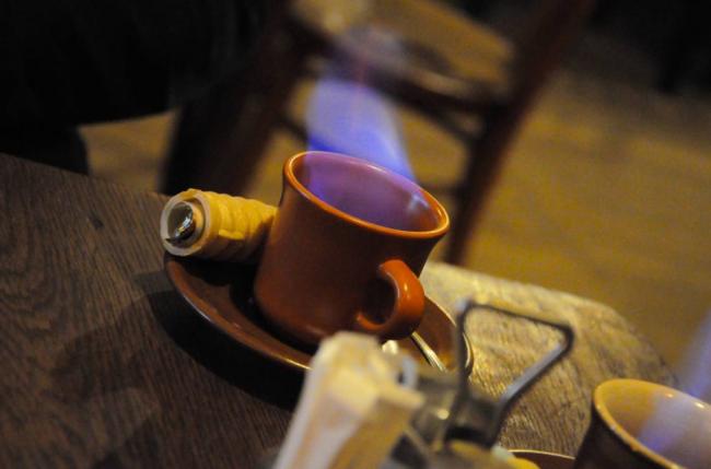 Для обжарки обливают сахар спиртом и коньяком, после чего поджигают. Немного расплавленный рафинад выкладывают в чашку и перемешивают