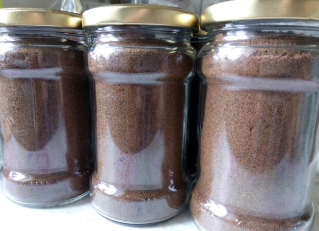 Далее нужно перемолоть плоды в порошок. Для этого можно использовать кофемолку или мясорубку. Важно, чтобы порошок получался абсолютно сухим. Если это не так, перемолотые плоды рассыпают по противню и еще раз обжаривают. Хранить готовый порошок нужно в стеклянной банке.