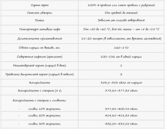 Мокка с мятным сиропом имеет легкий сливочный вкус. Количество ккал позволяет без вреда для фигуры пить любимый напиток дважды-трижды в день.