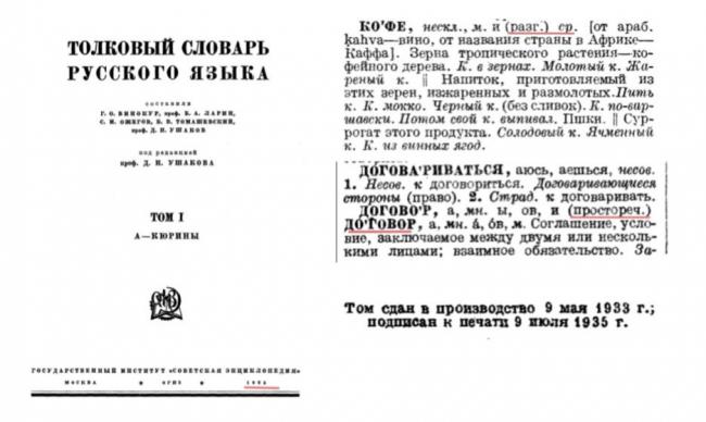 Что ж, посмотрим, что о договоре и кофе говорит авторитетный в советские годы словарь Ушакова (откроем первое издание 1935–1940 годов):