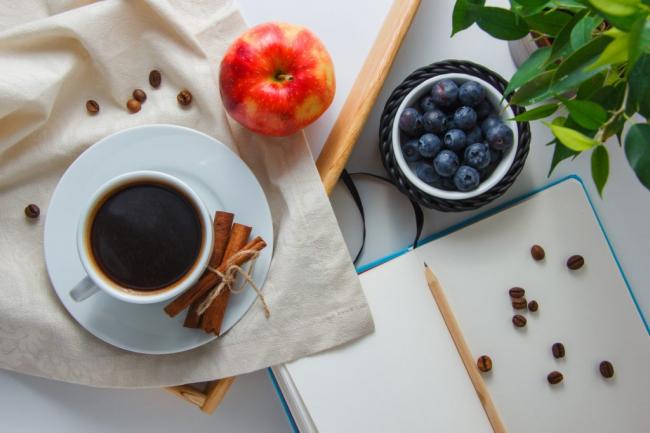 A cup of coffee with blueberries, apple, dry cinnamon, plant, pencil and notebook top view on a white background