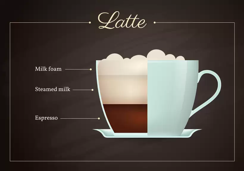 In contrast, a standard latte features one full espresso shot (30ml) combined with steamed milk and froth, resulting in a milder taste as it has more milk diluting the coffee’s strength.