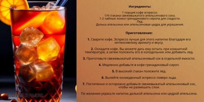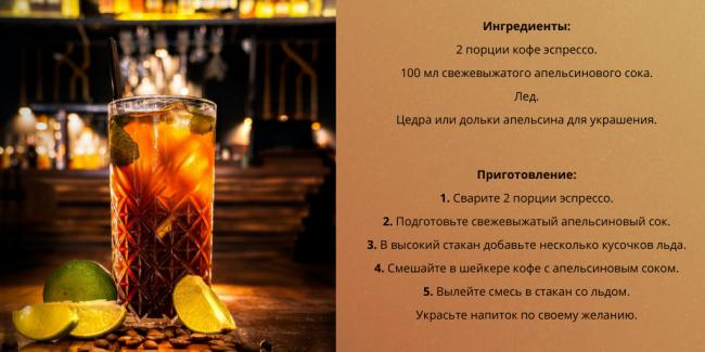 Для его приготовления используют два вида кофе (американо и эспрессо), которые смешивают, добавляя в получившийся коктейль свежевыжатый сок апельсина. Подойдет и сок в пакетах, купленный в магазине. Единообразия в пропорциях нет. Однако гурманы советуют придерживаться соотношения 1:3, где первая цифра показывает процент сока. В получившийся напиток непременно нужно добавить кубики льда, чтобы получить полное раскрытие истинного вкуса. Однако перебарщивать со льдом не стоит. На бокал достаточно 2-3 кубиков.