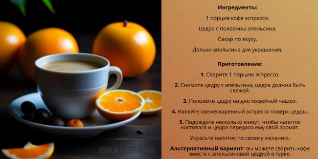 - Чтобы эфирные масла апельсина сделали вкус кофе более концентрированным, молоть цедру нужно вместе с зернами арабики.