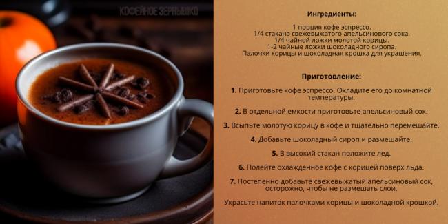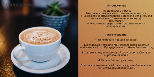 Апельсиновый и кофейный вкусы хорошо сочетаются в любых пропорциях и видах. Можно использовать сиропы, свежий цитрус, сок, цедру и т.д.